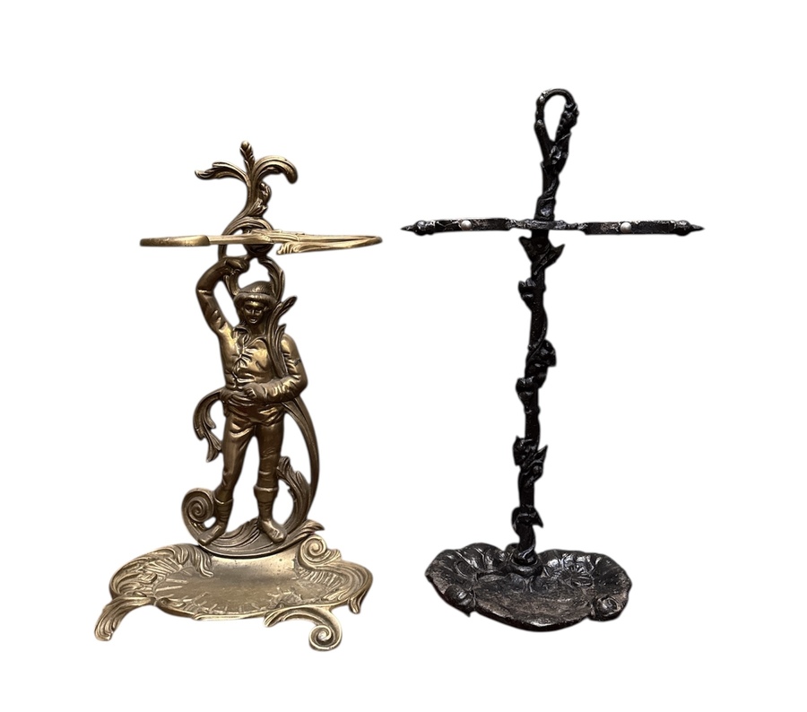 Paraplustandaards vervaardigd uit messing en ijzer met gegoten en gesmede techniek. Het paar bestaat uit twee ongelijkvormige exemplaren: een gegoten messing standaard met figurale jongeman, florale opbouw en geïntegreerde lekbak en een smeedijzeren standaard met getorste stam, bladmotieven, dwarsarmen en bloemvormige voet. Het geheel dateert uit de tweede helft van de 19e eeuw en heeft een West-Europese herkomst.