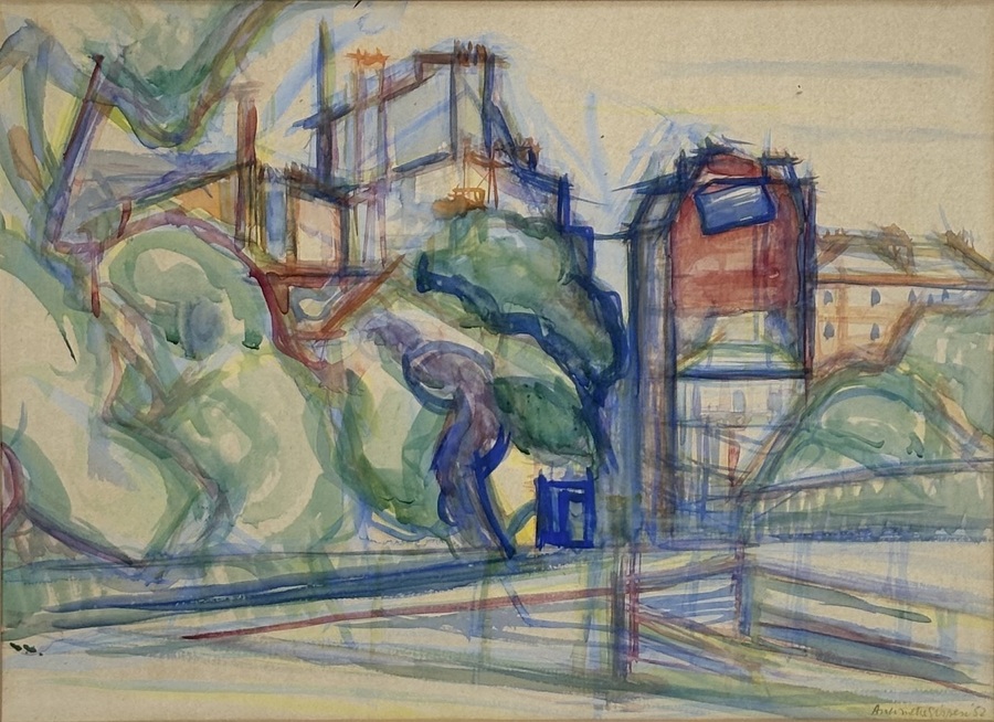 Aquarel door Antoinette Gispen (1921–2015) toont een expressief stadsgezicht in modernistische stijl, uitgevoerd in aquarel op papier. De compositie wordt gekenmerkt door krachtige, blauwe contourlijnen die contrasteren met de transparante kleurvlakken van het rode gebouw en het loof. Gesigneerd en gedateerd rechtsonder “A. Gispen ’52”. Het werk dateert uit 1952 en heeft een Nederlandse herkomst. Ingelijst in een witte lijst met passe-partout.