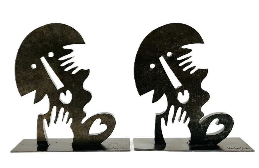 Paar beeldjes door Wouter Stips (1944) in postmoderne stijl, vervaardigd uit gepatineerd staal met industrieel gesneden contouren. Deze wensbeeldjes, getiteld "Dierbaar", tonen een karakteristieke antropomorfe vormentaal met een hartvormige uitsparing. Het wensbeeldje bevat een verborgen opening in de bovenzijde voor het plaatsen van een wens. Gesigneerd op de voetplaat, circa 2010 en een Nederlandse herkomst.