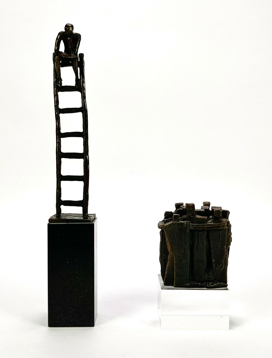 Beelden van Corry Ammerlaan- van Niekerk (1947) en Frans Steginga (1953) in modernistische stijl, uitgevoerd in brons op granieten en acrylaat sokkels. Een beeld toont een peinzend figuur op een hoge ladder, het andere beeld een een geabstraheerde mensengroep. Datering tweede helft 20e eeuw, Nederlandse herkomst.