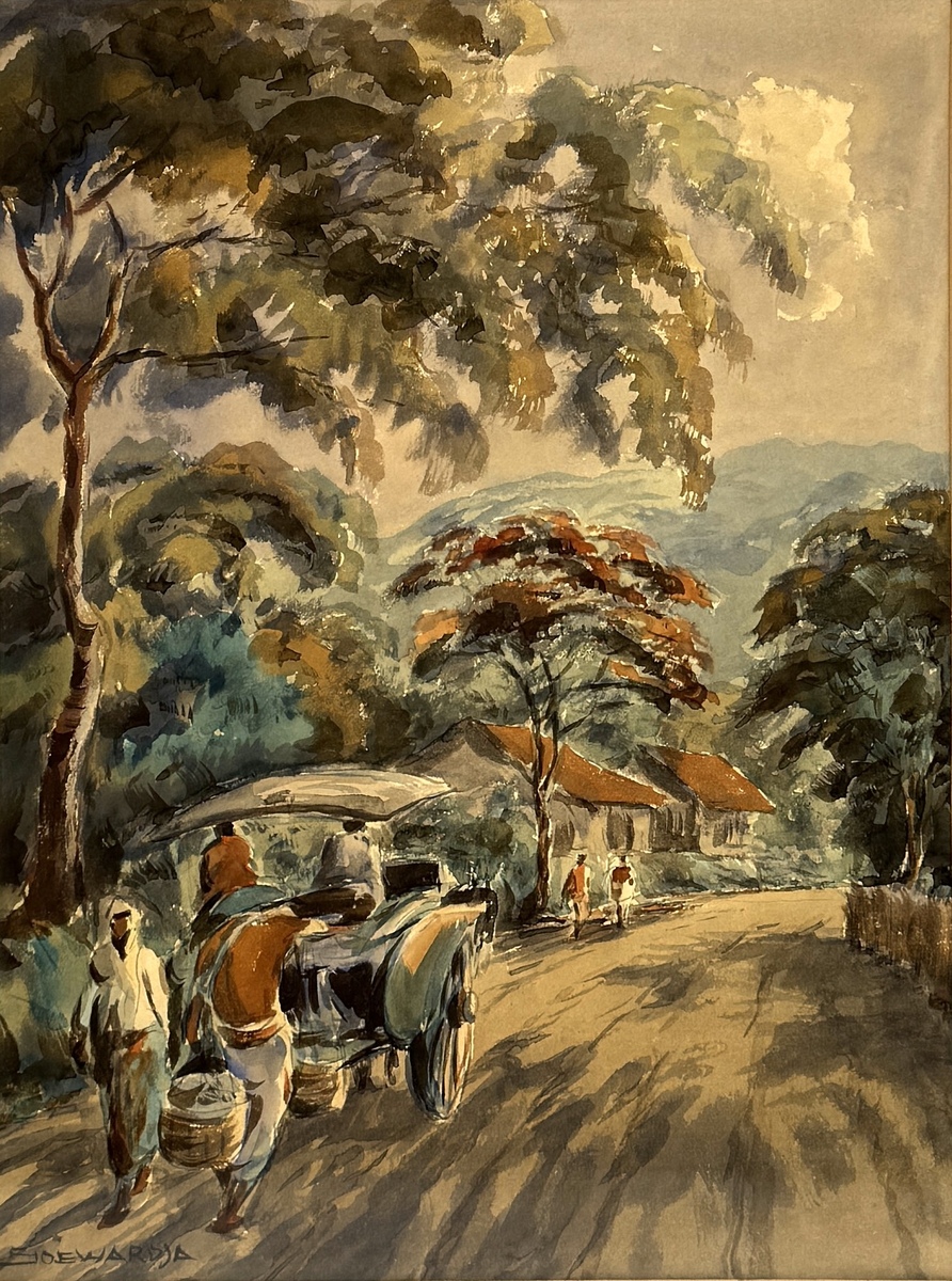 Aquarel door Soewardja (1900–1968) in Mooi Indië stijl, uitgevoerd op papier met een transparante techniek. De voorstelling toont een levendig straatbeeld met een ossenwagen op een onverharde weg, omgeven door tropische vegetatie en bergen in de verte. Het werk is linksonder gesigneerd. De aquarel dateert uit het midden van de twintigste eeuw en heeft een Indonesische herkomst.