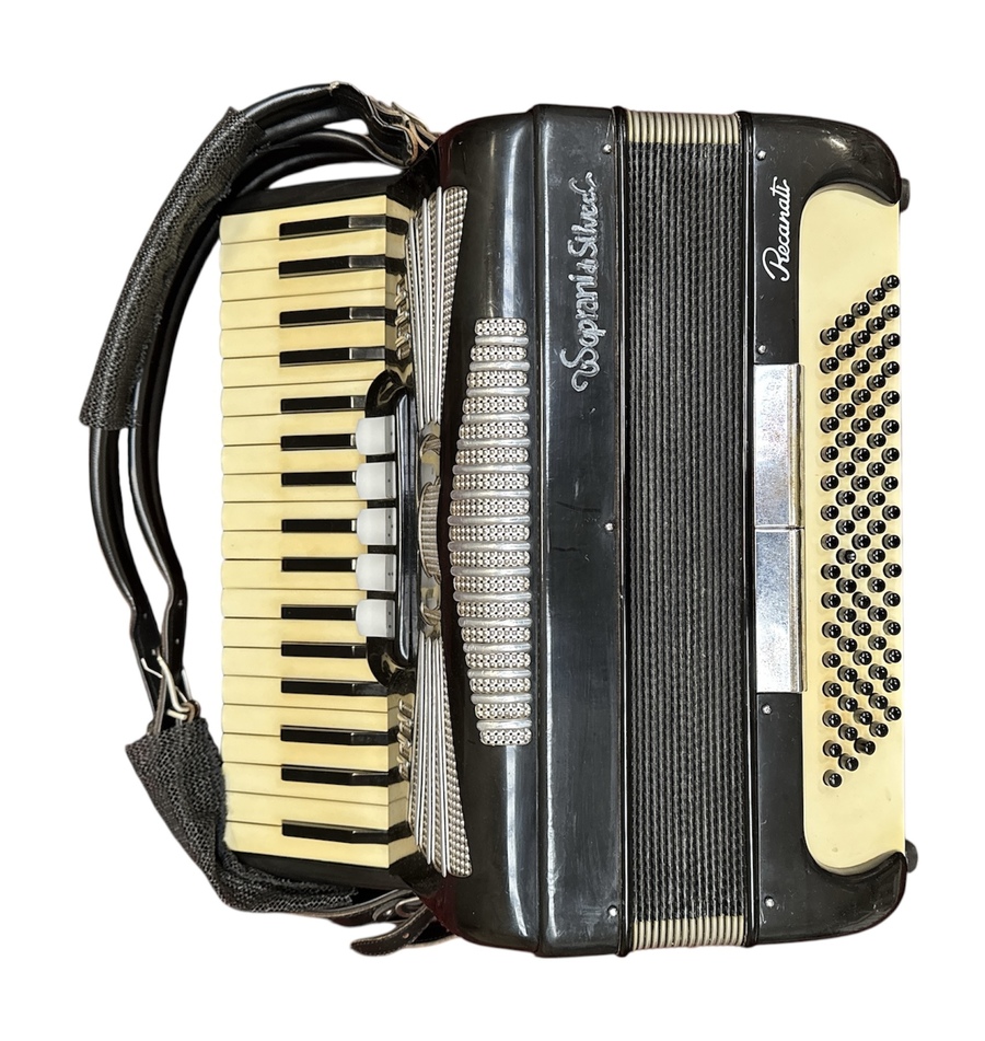 Accordeon van Soprani & Silvestri, vervaardigd uit celluloid, metaal en hout. Het instrument toont een pianoklavier met achtendertig toetsen en een basklavier met tachtig knoppen. Gemerkt met de fabrieksnaam en Recanati op het voorblad, daterend uit ca. 1960 en een Italiaanse herkomst.