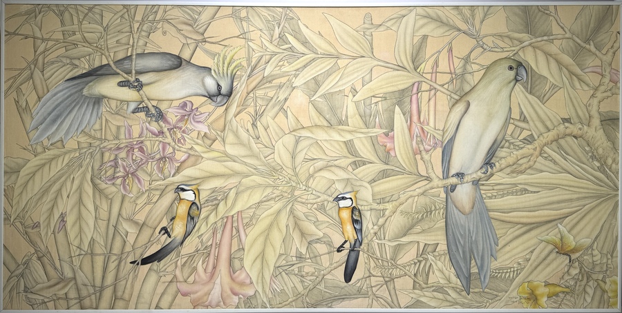 Gouache op doek uit de Indonesische School, 20e eeuw, toont papegaaien en zangvogels in een dicht netwerk van takken en bladeren in surrealistische stijl. Rechtsonder gesigneerd, Nyoman Sumatra, Ubud Bali en gedateerd ’86. De compositie combineert gedempte oker- en grijsgroene tonen met gele en roze bloeiwijzen.