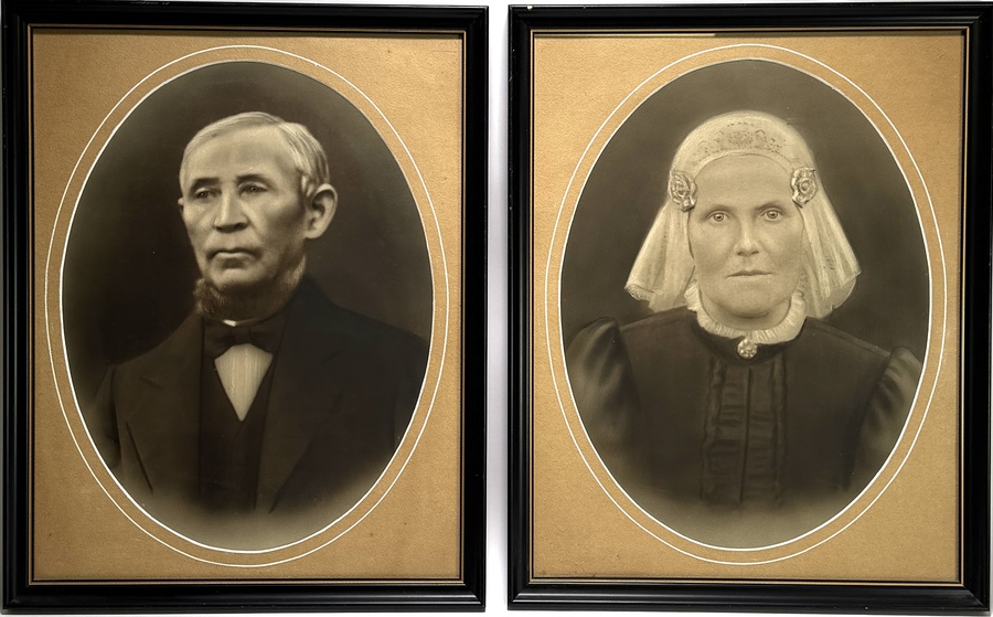 Twee formele fotografische portretten in realistische stijl, uitgevoerd als albuminedruk op papier, gemonteerd op karton. De portretten bestaan uit een man en een vrouw in traditionele 19e-eeuwse kleding. De foto's dateren uit de tweede helft van de 19e eeuw, Nederlandse herkomst.