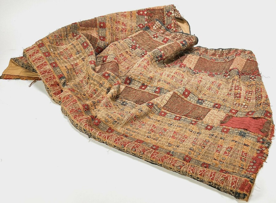 West-Afrikaans wandkleed uit de 20e-eeuw, vervaardigd uit handgeweven katoenen stroken met talrijke schijfapplicaties en geometrisch borduurwerk. De vlakken tonen ruitpatronen en vlechtmotieven in indigo en oker, typerend voor de ceremoniële prestigekunst binnen de West-Afrikaanse cultuur.