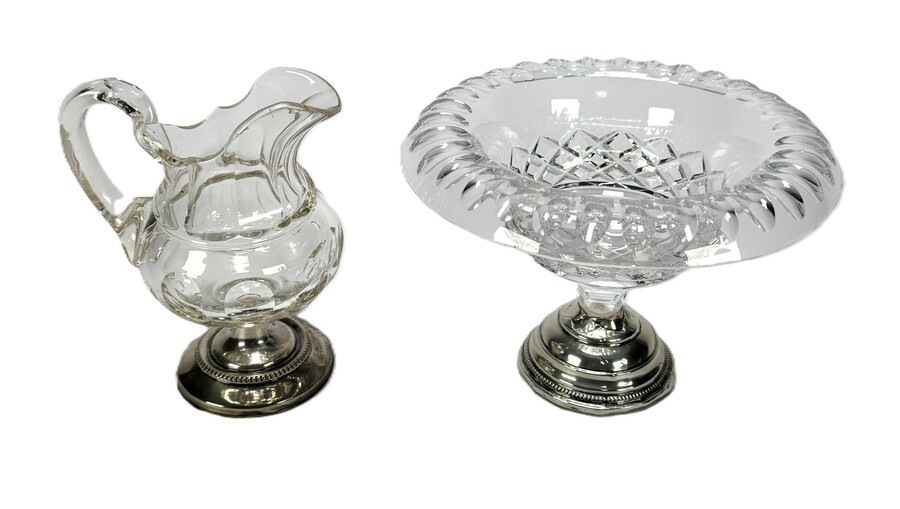 Glazen tafelstukken uit de neoclassicistische periode, circa 1900, vervaardigd uit ruitgeslepen kristalglas met verzilverde monturen. De set omvat een schenkkan en een met getande rand schaaltje, beide gedecoreerd met geometrische slijpvormen. De voeten zijn uitgevoerd met een parelrand en aan de onderzijde afgewerkt met hout en vilt.