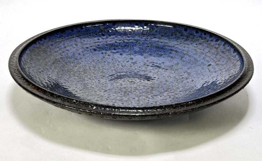 Schaal van Potterij Zaalberg uit de Mid-century modern periode, vervaardigd uit keramiek met een karakteristiek blauw-zwart reactief glazuur. De schaal toont een expressieve textuur met bellenstructuur. Onderzijde gemerkt met stempel en handgeschreven aanduiding. De schaal dateert uit circa 1965 en heeft een Nederlandse herkomst.
