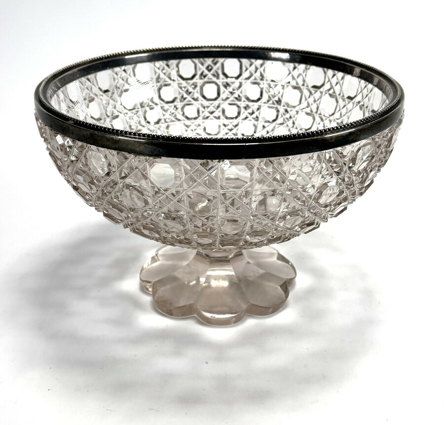 Schaal uit de Art Deco periode, circa 1925, vervaardigd uit kristal met een zilveren montuurrand. De schaal toont een coupe op achtkantige voet met een diep geslepen diamantpatroon in een geometrische ordening. De metalen rand is voorzien van een verfijnd kralenprofiel. Deze schaal heeft een Europese herkomst en is karakteristiek voor de tafelcultuur uit het interbellum.