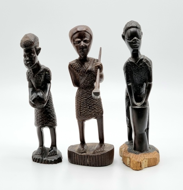 Drie verschillende uit hout gesneden beelden, Makonde stam Tanzania, midden 20e eeuw.