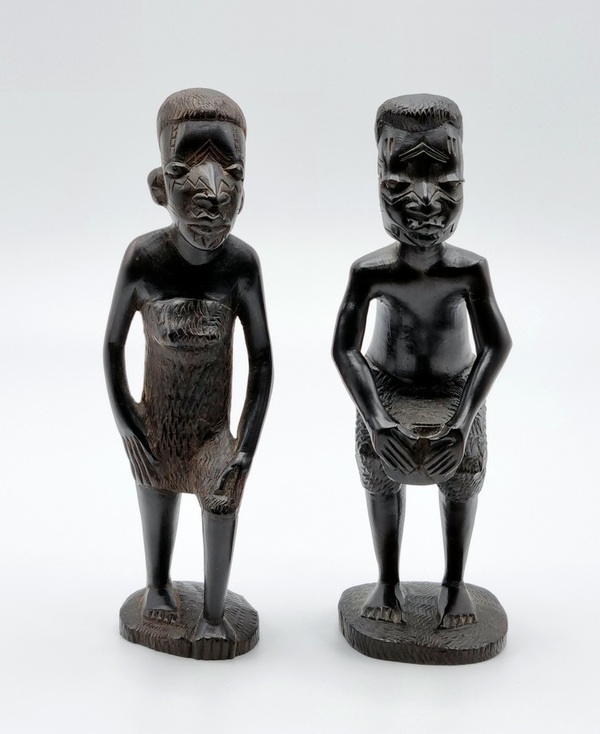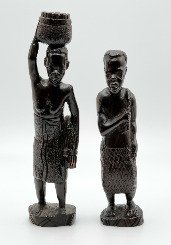 Twee verschillende uit hout gesneden beelden van een man en een vrouw, Makonde stam Tanzania, midden 20e eeuw.