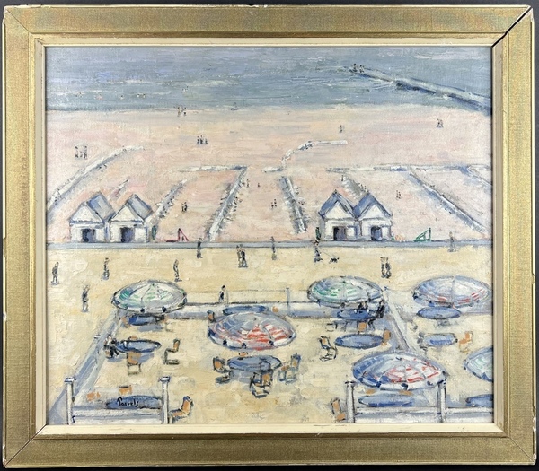 Schilderij, olieverf op doek, strand bij Oostende. Linksonder gesigneerd Paerels, circa 1935.