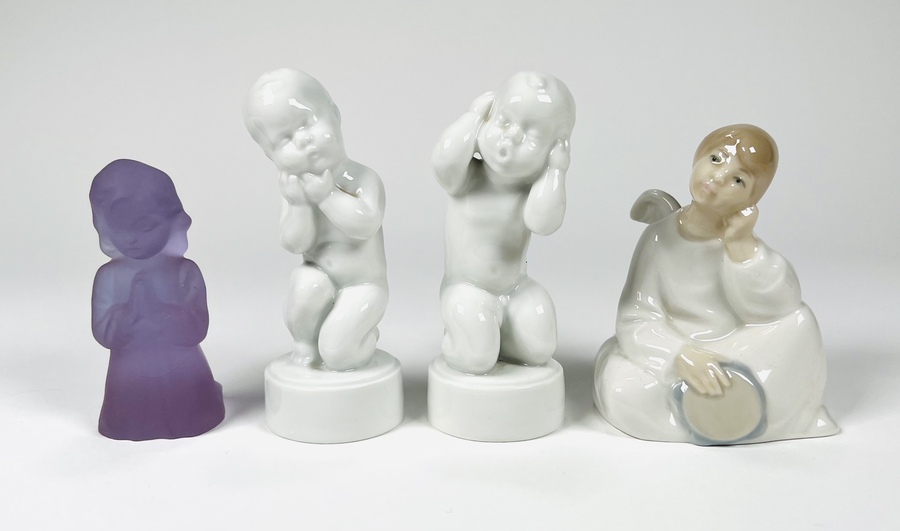 Vier beeldjes waarvan drie uitgevoerd in porselein, twee wit geglazuurde kinderbeeldjes van Bing & Grondahl (Denemarken) aan de onderzijde gemerkt met B&G, Copenhagen en modelnummer, een porseleinen engel beeldje van Lladro Nao, aan de onderzijde gemerkt Nao en vermelding Made in Spain en een lilakleurig persglazen biddend kind. Vierde kwart 20e eeuw.