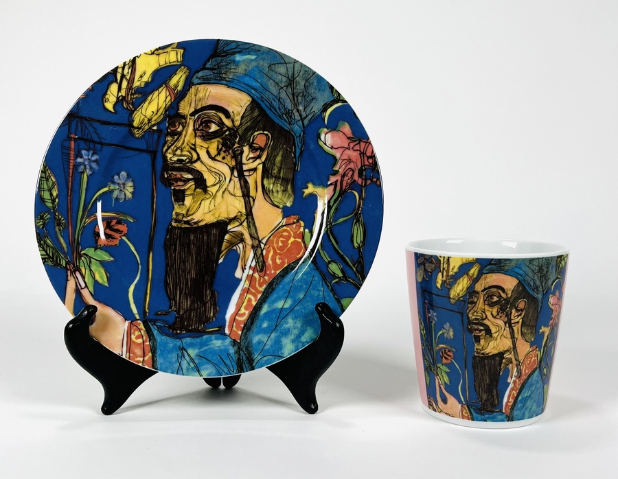 Kunstzinnig porseleinen bord en beker uitgevoerd door Heinrich Winterling naar een ontwerp van Piet Schopping. Gemerkt op de achterzijde met het Heinrich Winterling Marktleuthen merk en de signatuur van Piet Schopping, 2007 Ateliers Amerpoort.