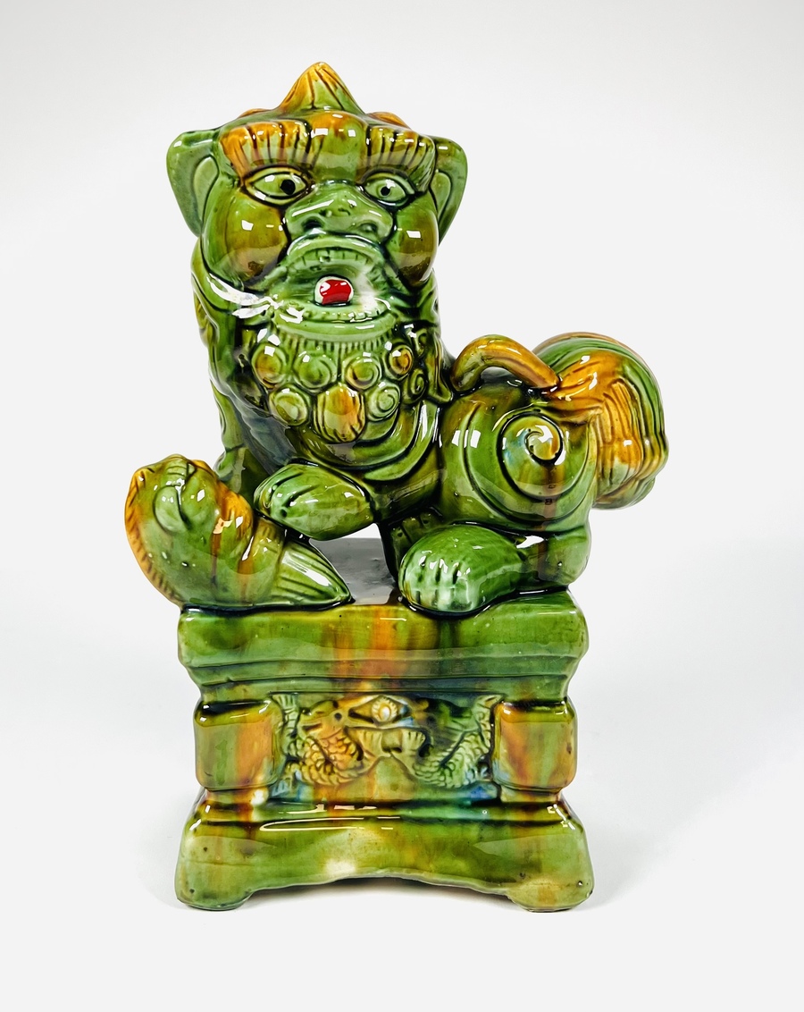 Een keramieken groen en geel geglazuurd beeld van Foo Dog. China, tweede helft 20e eeuw.