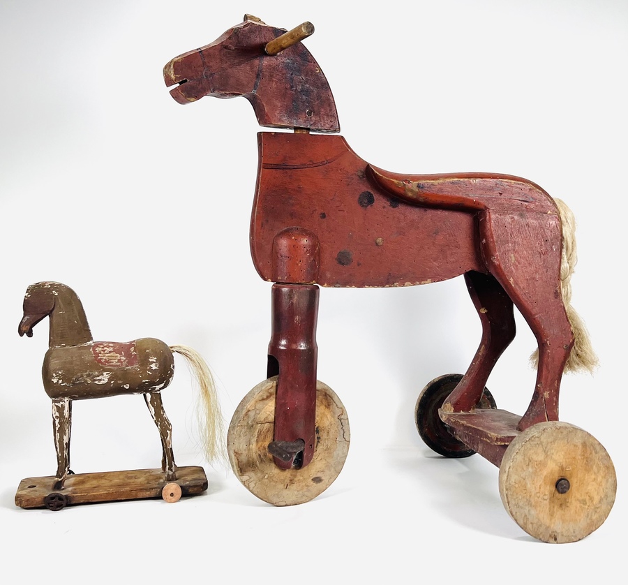Een houten driewieler in de vorm van een paard, hierbij een klein houten paard op wieltjes. Midden 20e eeuw