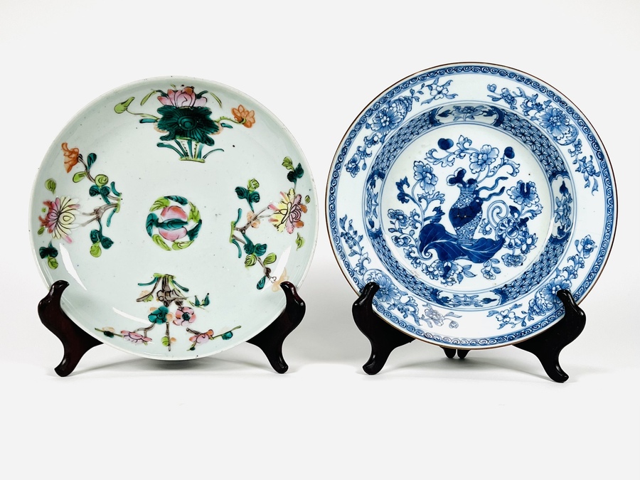 Twee Chinese porseleinen borden, een blauw-witte handbeschilderd bord met florale decoratie uit de Chien Lung periode, 1740-1750. Tweede porseleinen Chinese bord polychroom beschilderd met floraal decor, aan de achterzijde gestempeld, omstreeks 1900.