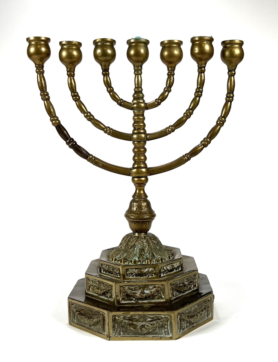 Bronskleurige messing menora gedecoreerd met acanthusbladeren en florale elementen en guirlandes. Een menora op groot formaat. Eerste helft 20e eeuw.