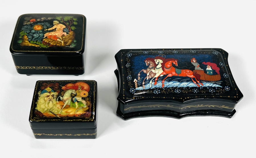 Drie Russische Palekh handgeschilderde lakwerkdozen met afbeeldingen van een winterlandschap met arrenslee, een ridder te paard en zittende man met vis. Gesigneerd op de deksels, tweede helft 20e eeuw.