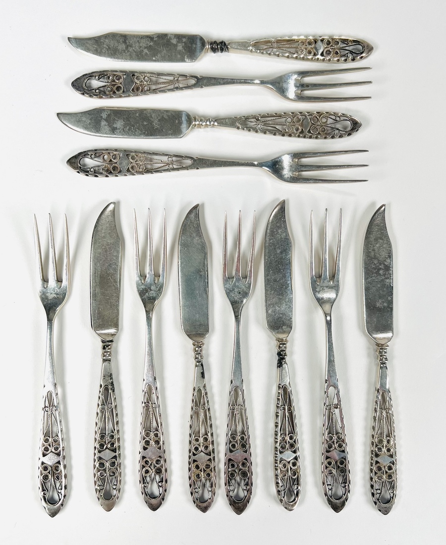 Zes persoons ajour bewerkt verzilverd visbestek met filigraine invulling. Verzilverde aanduiding 80 gestempeld op zowel messen als vorken. Tweede kwart 20e eeuw.