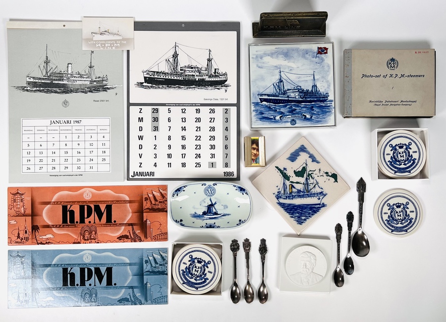 Lot met K.P.M. (Koninklijke Pakketvaart Maatschappij) bestaande uit keramieken onderzetters, theelepels, een paar Tichelaar aardewerken tegels met bootafbeeldingen, twee jaarkalenders 1986/87, een presse-papier M.S. Boissevain en boekje met verschillende foto’s van KPM steamers. Nederland, derde kwart 20e eeuw.