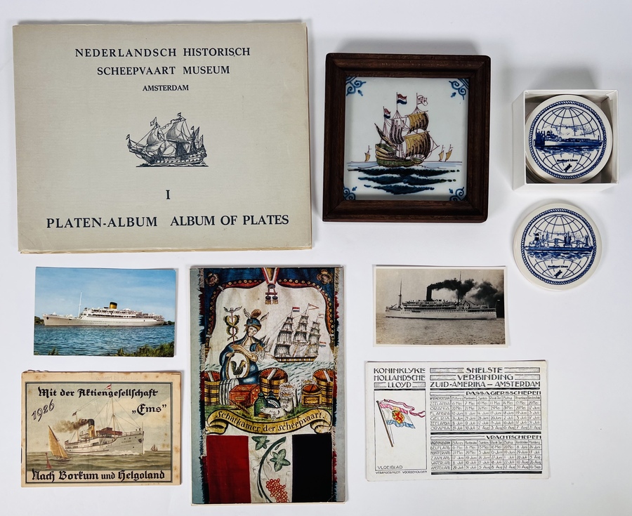 Lot maritiem met ingelijste Makkumer tegel met 17e-eeuws zeilschip, vier keramieken onderzetters van Nedlloyd Lines, twee platenalbums van het Nederlandsch Historisch Scheepvaart Museum, deel I en II, uitgaven uit 1963. Uitgave De Schatkamer der Scheepsvaart uit 1966. Twee ansichtkaarten van passagiersschepen. Historisch document Aktiengessellschaft Ems. Nach Borkum und Helgoland uit 1926.