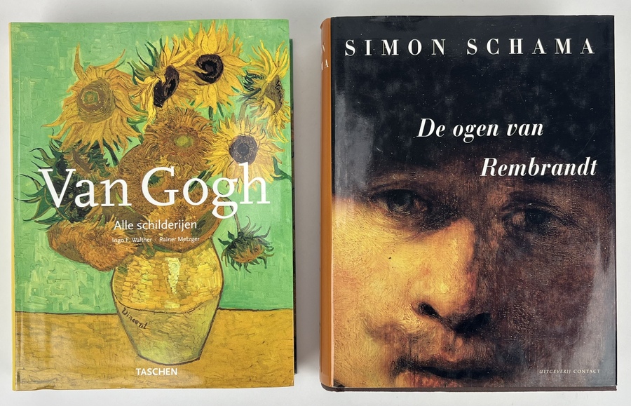 Twee kunstboeken, "De Ogen van Rembrandt" door Simon Schama, uitgave uit 2019 en "Vincent van Gogh alle schilderijen", deel 1, een Taschen uitgave uit 2001.