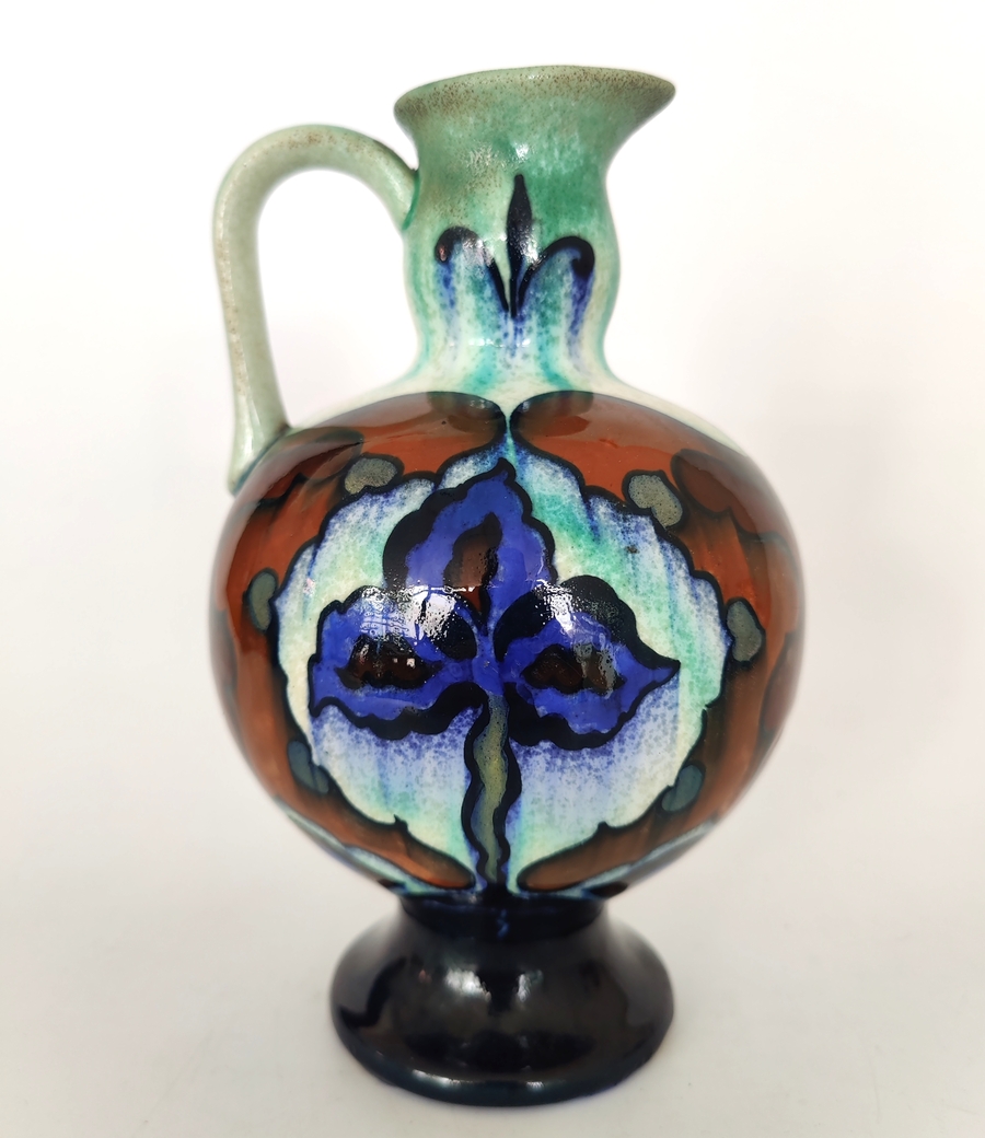 Schenkkan met Jugendstil decor van De Distel, Amsterdam. Gemerkt aan de onderzijde met stempel en voorzien van modelnummer. Eerste kwart 20e eeuw.