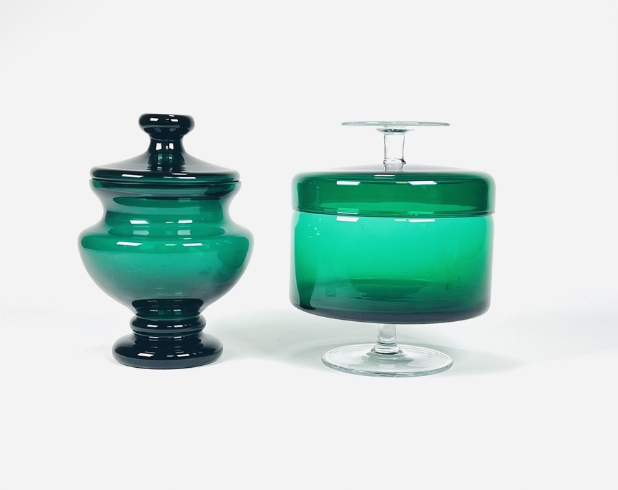 Twee groene glazen koekjespotten. Een koekjespot met helderglazen voet en handvat door glasfabriek Scott-Zwiesel naar ontwerp van Heinrich Löffelhardt, Duitsland, jaren 70. En een geheel groene ambachtelijk gevormde koekjespot uit de Bohemen, eerste helft 20ste eeuw.
