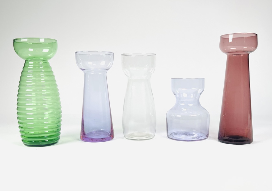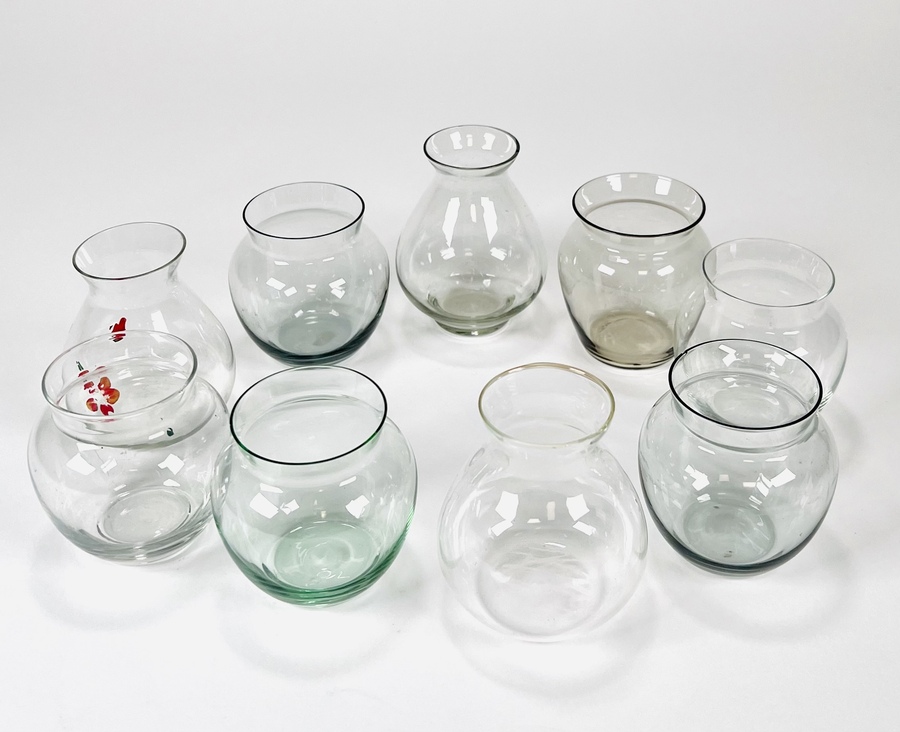 Negen lentebloem vaasjes gefabriceerd door Glasfabriek Leerdam. jaren 20/30.
