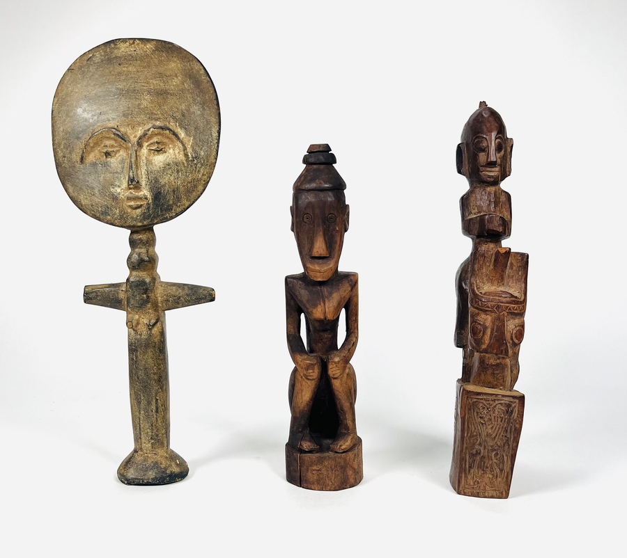Drie Afrikaanse houten beelden waaronder een Ashanti stam vruchtbaarheidsbeeld, 20e eeuw.
