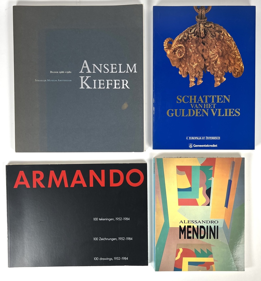 Vier kunstboeken over Anselmn Kiefer, Allesandro Mendini, Armando en een algemeen boek "Schatten van het Gulden Vlies". Vierde kwart 20e eeuw.