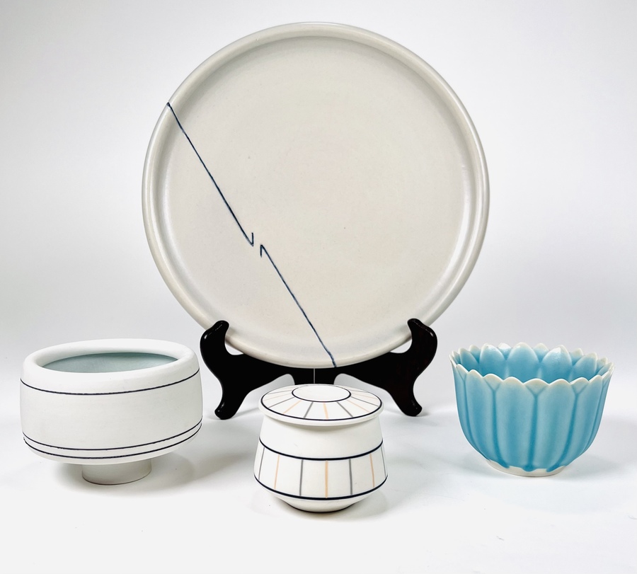 Lot keramiek met een schotel, dekselpot en twee kommen. Deels gesigneerd, vierde kwart 20e eeuw.