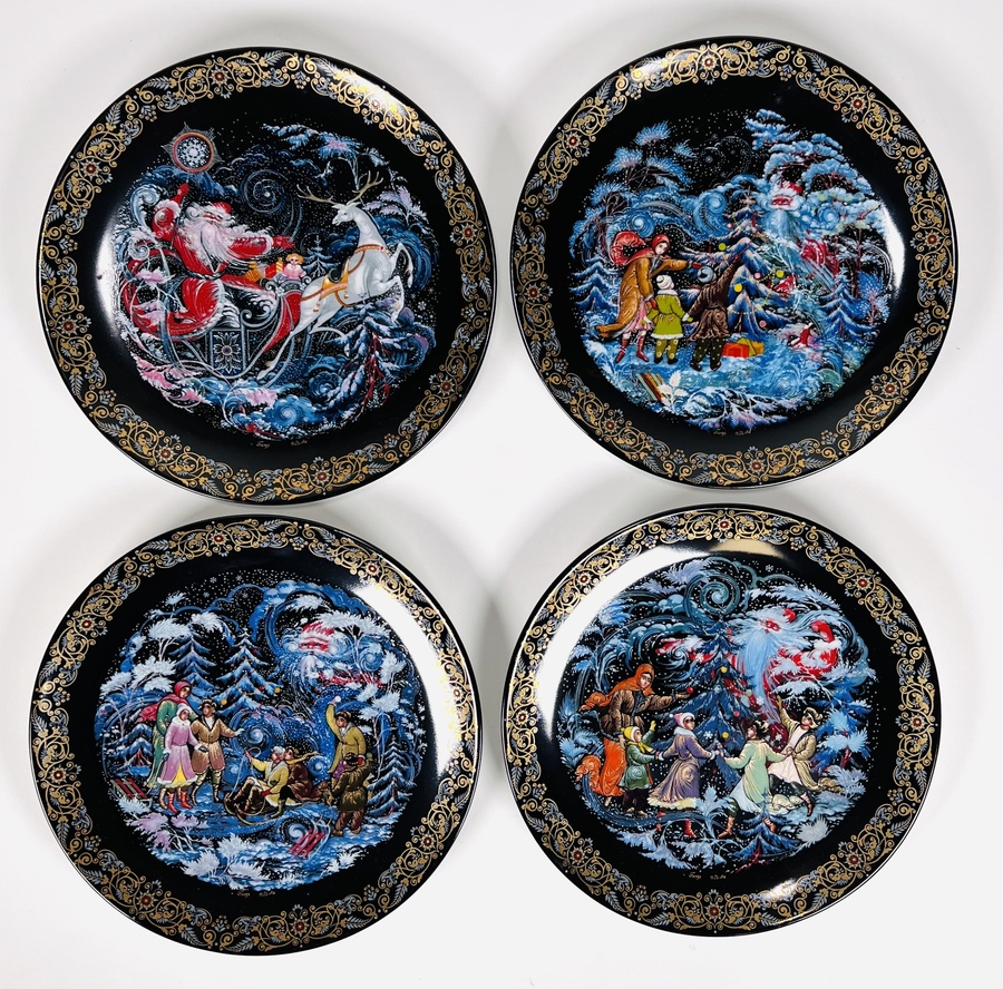 Vier Russische Palekh stijl porseleinen wandborden met verschillende wintertaferelen voorzien van certificaat en afzonderlijke nummering. Datering eind jaren 80.