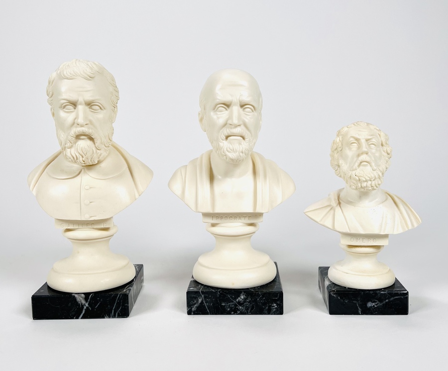 Drie polystone bustes op marmeren basement van Galileo Galilei, Hippocrates en Homerus, vervaardigd door G. Rugerri. Aan de onderzijde gemerkt met sticker. Made in Italy, vierde kwart 20e eeuw.