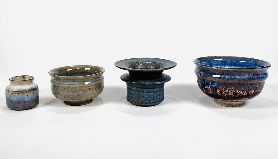 Lot keramiek met twee geglazuurde vazen en twee geglazuurde kommen. Een kom gemonogrammeerd met KH. Vierde kwart 20e eeuw.