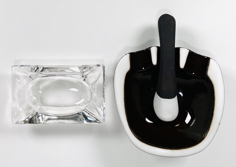 Twee asbakken, een keramieken donkerbruin-wit ambachtelijk gevormde asbak met doof staaf door Jaap Ravelli Valkenburg en een helderglazen asbak. Jaren 70.