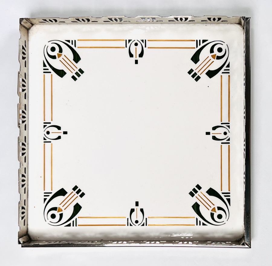 Onderzetter met Jugendstil tegel van Chris van der Hoef gevat in vernikkeld montuur. Aan de onderzijde gemerkt met modelnummer 1831. Tweede kwart 20e eeuw.
