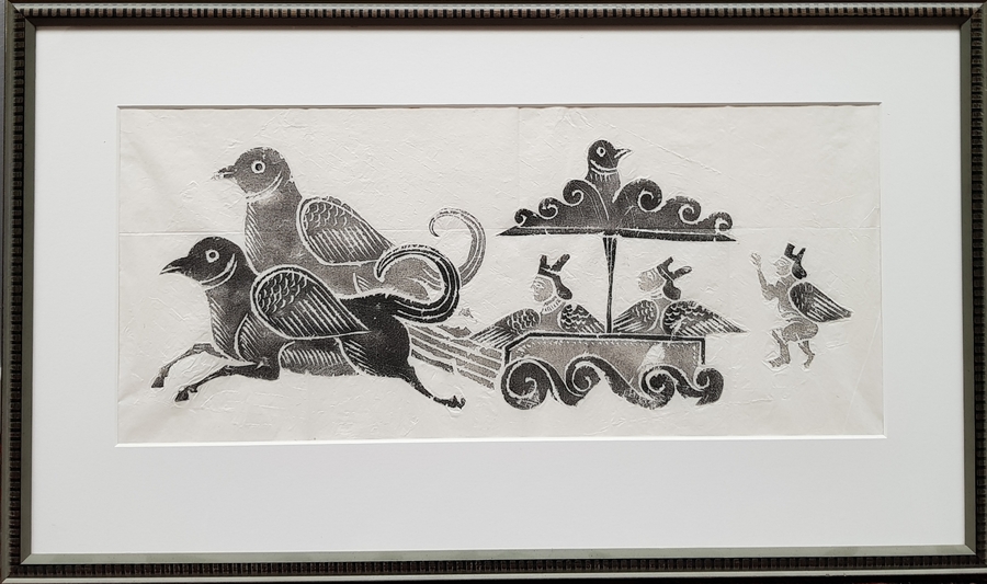 Een fantasievolle houtdruk op handgeschept papier. Ongesigneerd, verso vermelding van de naam Anne Buchthal London, 20e eeuw.