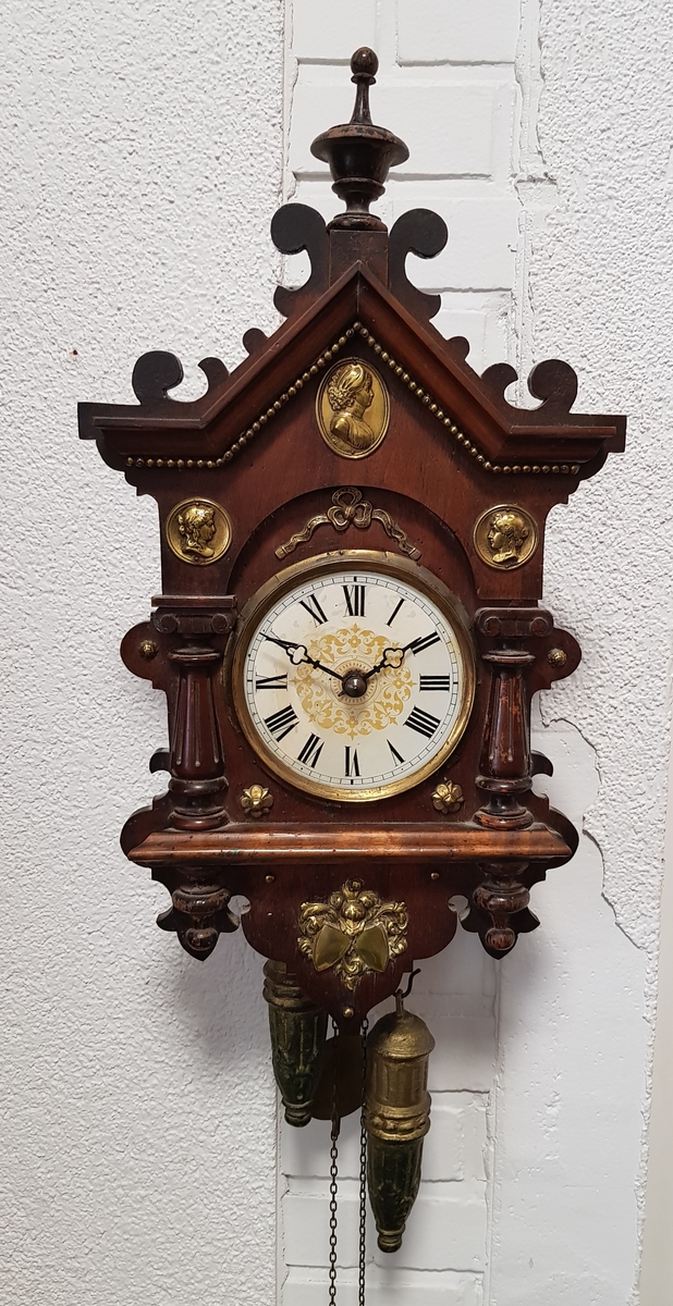Antieke Duitse notenhouten Schwarzwald klok met latoenkoperen applicaties met vrouwen portretten. Eind 19e eeuw.