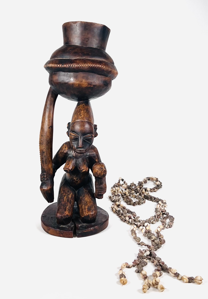 Afrikaans houtgestoken tribaal beeld van een kruik dragende vrouw met slang in de hand. Kruik gevuld met schelpenketting. Afrika, 20e eeuw.