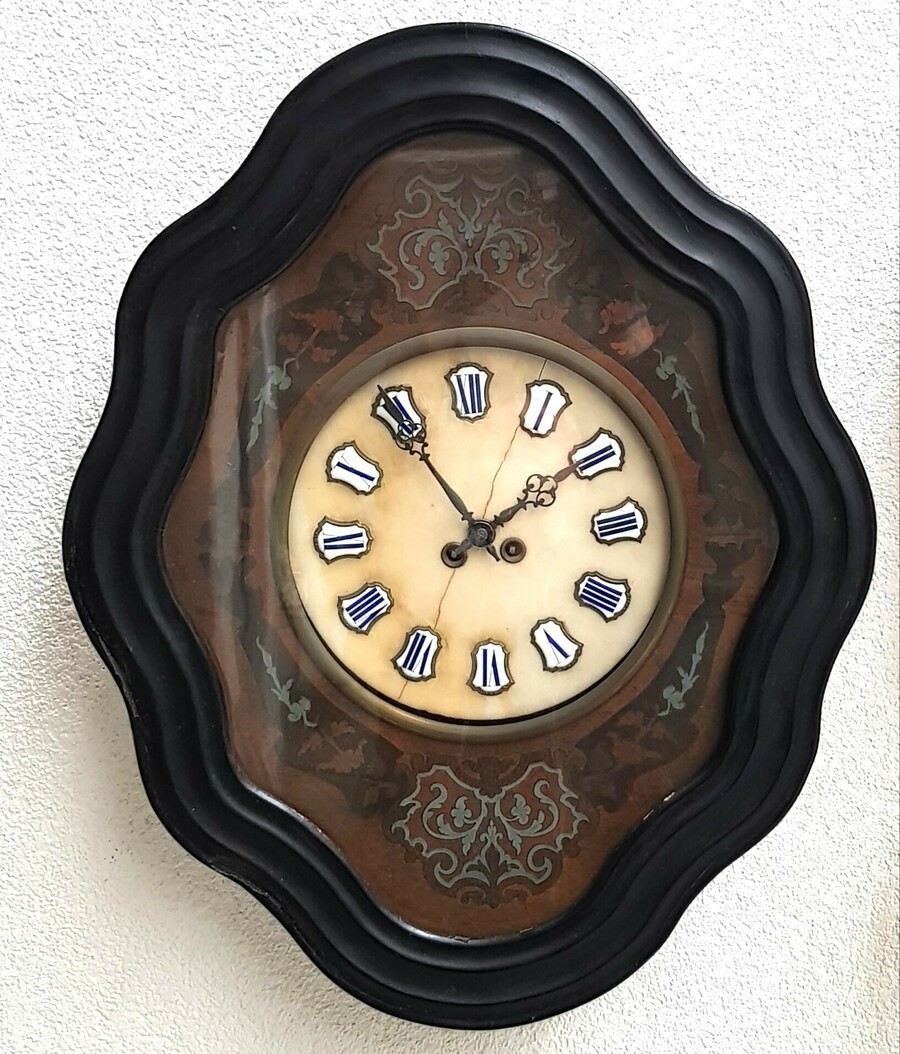 Franse houten wandklok oeil de boeuf, ofwel ossenoog klok met albasten wijzerplaat en geëmailleerde Romeinse cijfers. Frankrijk, eind 19e eeuw.