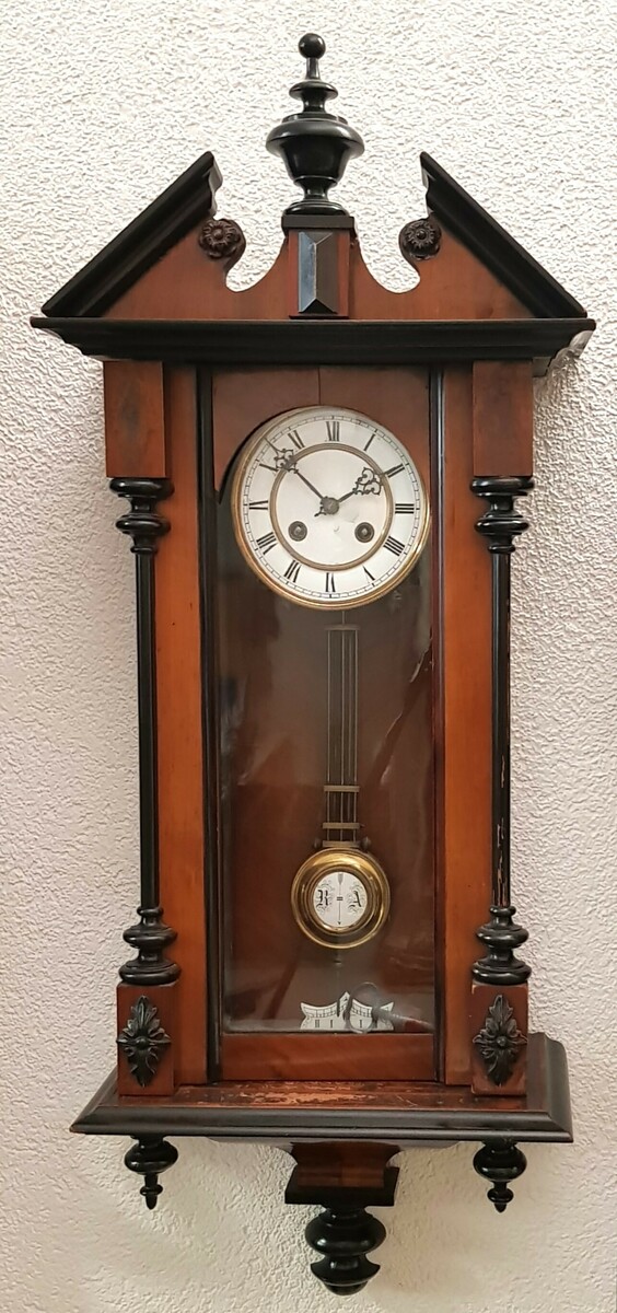 Duitse regulateur van notenhout met geëboniseerde pilaren en overige accenten, voorzien van een geëmailleerde wijzerplaat en slinger. Omstreeks 1900.