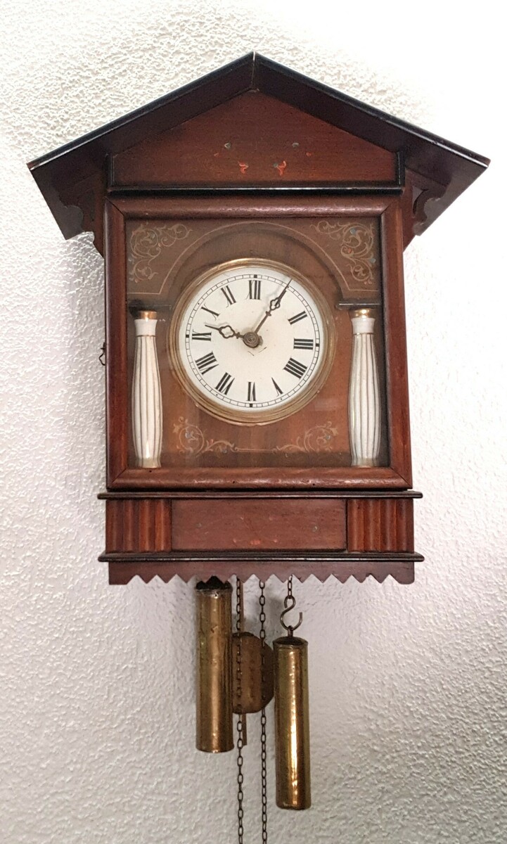 Houten huisjesklok met witte geëmailleerde wijzerplaat en porseleinen pilaren. Duitsland, eerste kwart 20e eeuw.