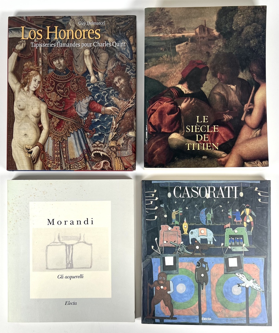 Vier kunstboeken, twee Franse boeken over Vlaams tapijtwerk getiteld "Los Honores, Tappiseries Flamendes pour Charles Quint"en een kunstboek over Titiaan getiteld "Le Ciecle de Titien", Tevens twee Italiaanse kunstboeken over Giorgio Morandi en Felice Casorati. Vierde kwart 20e eeuw.