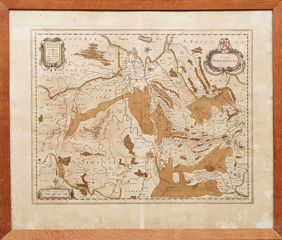 Cartografische kopergravure van Overijsel met de titel "Ditio Trans-Isulana" uit 1638, is oorspronkelijk uitgegeven door Johannes Janssonius in "Gerardi Mercatoris et I. Hondii". Atlas Novus te Amsterdam. 19e eeuw.