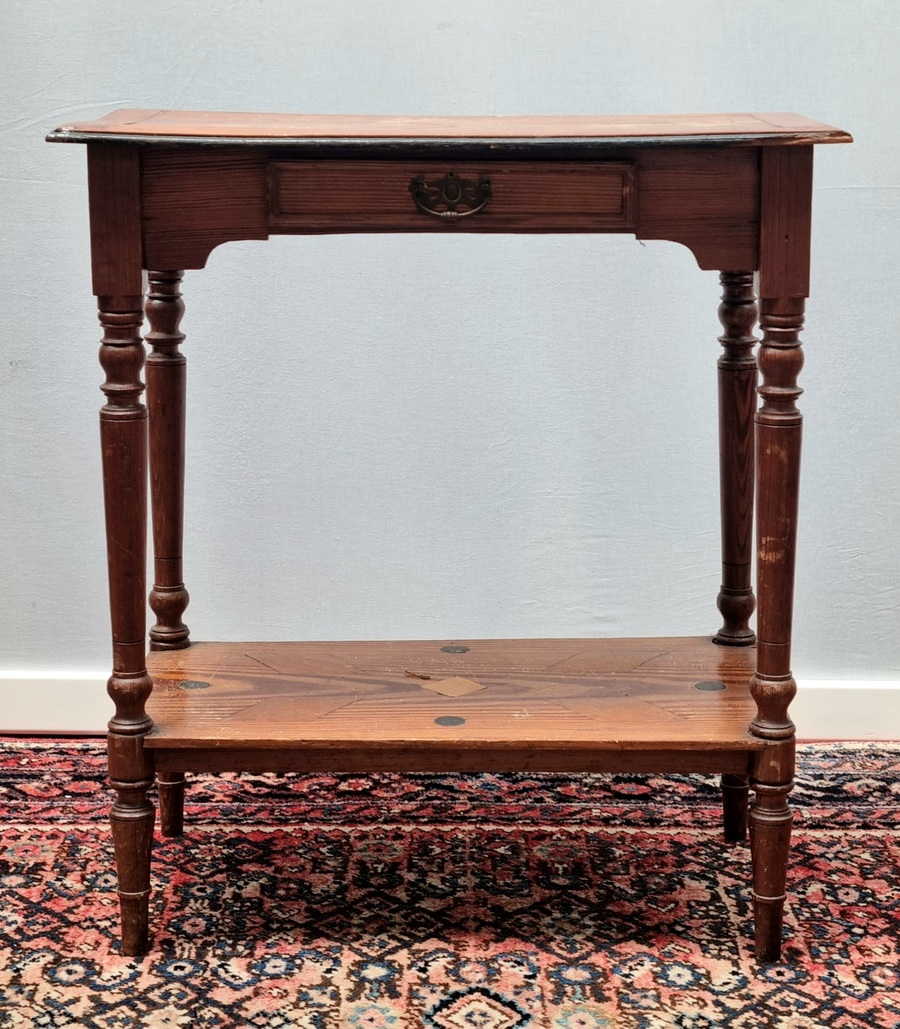 Bijzettafel in grenenhout met lade en voorzien van bronskleurig beslag. Eerste kwart 20e eeuw.