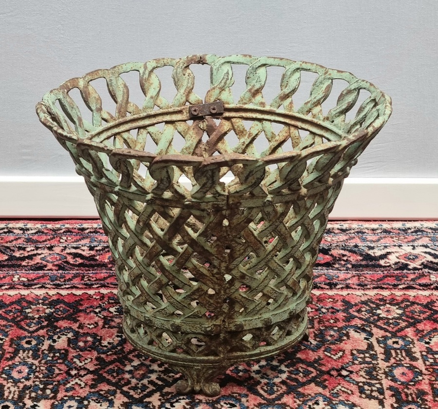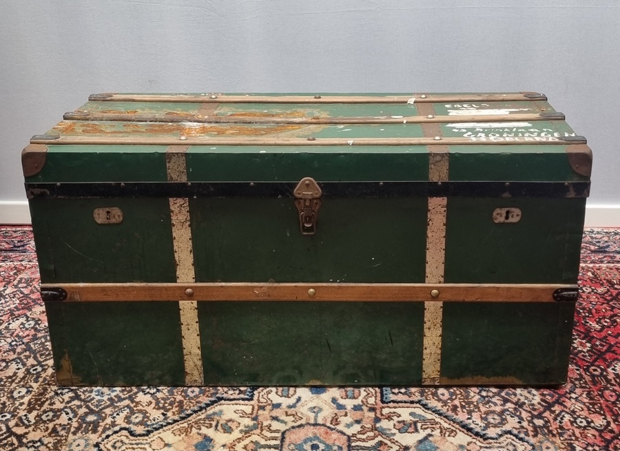 Groene metalen hutkoffer met houten spanbanden en messingkleurig beslag. Midden 20e eeuw.