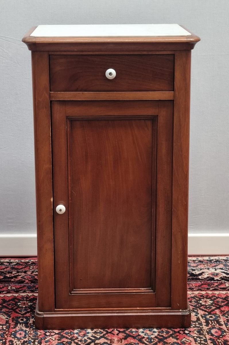 Houten nachtkastje met marmeren bovenblad en porseleinen knopjes. Frankrijk, eerste helft 20ste eeuw.