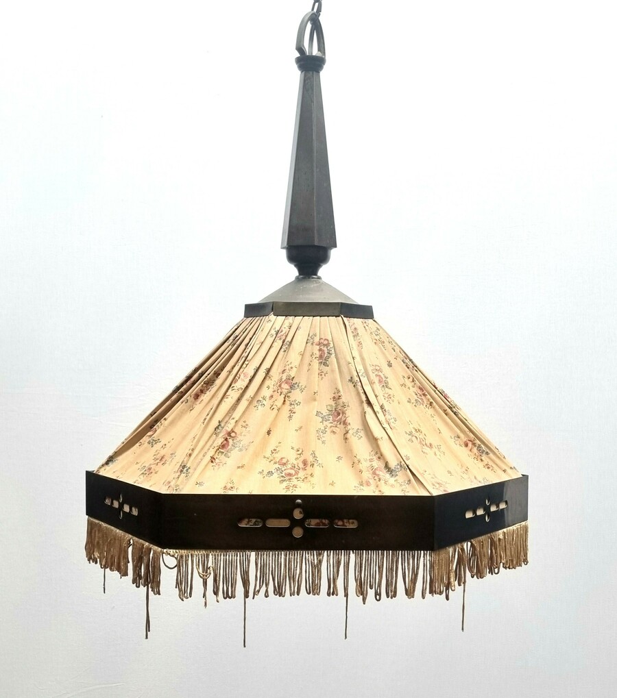 Amsterdamse School koperen hanglamp met florale stoffen bekleding. Jaren 20/30.