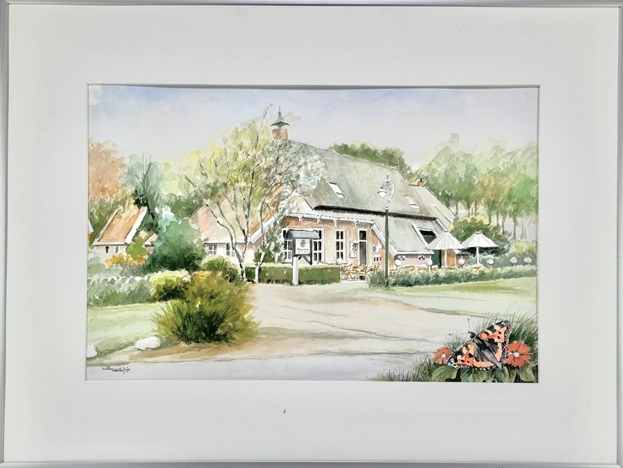 Aquarel van “De Vlindertuin” te Zuidlaren door Willem Wolthuis (1940). Linksonder gesigneerd en gedateerd 1996.